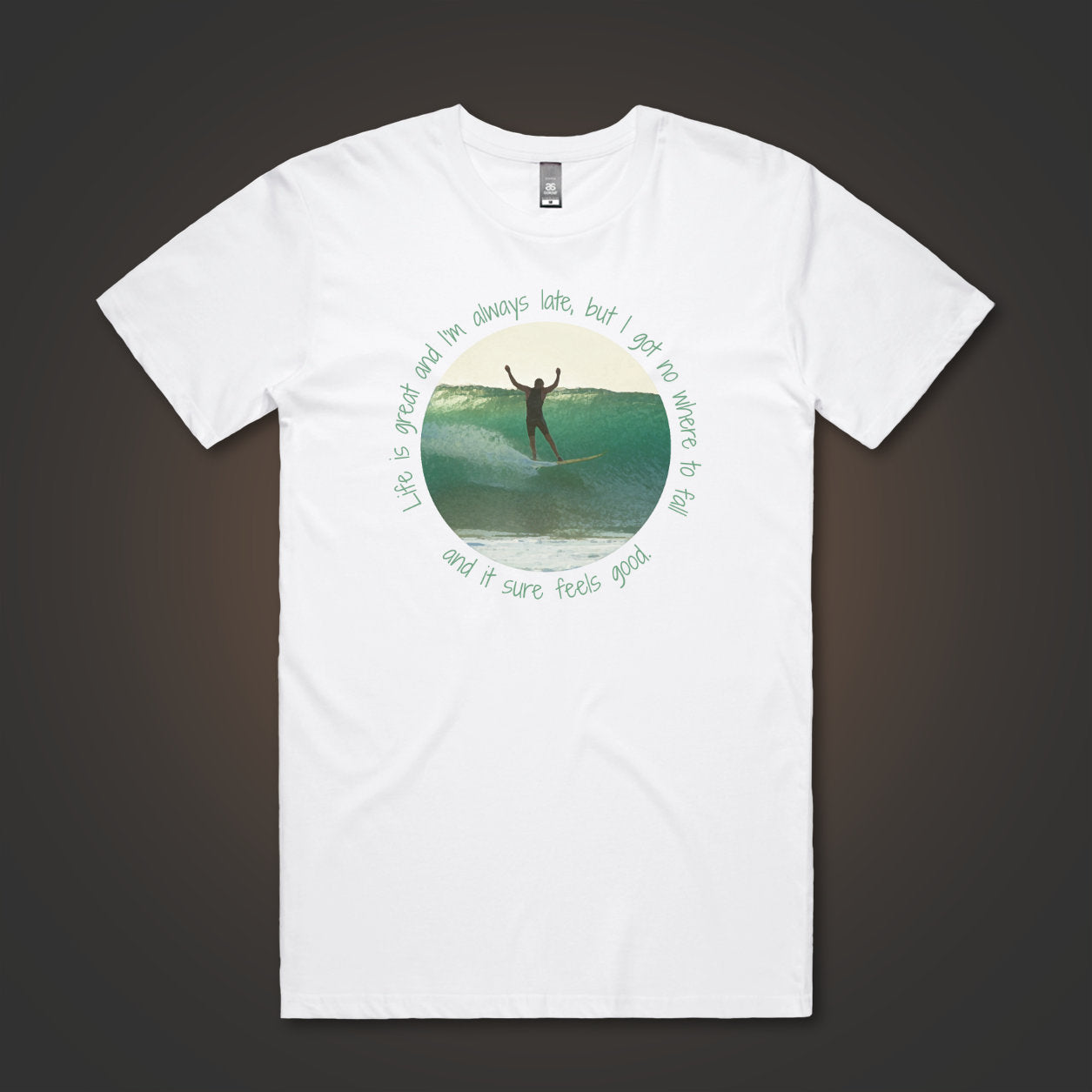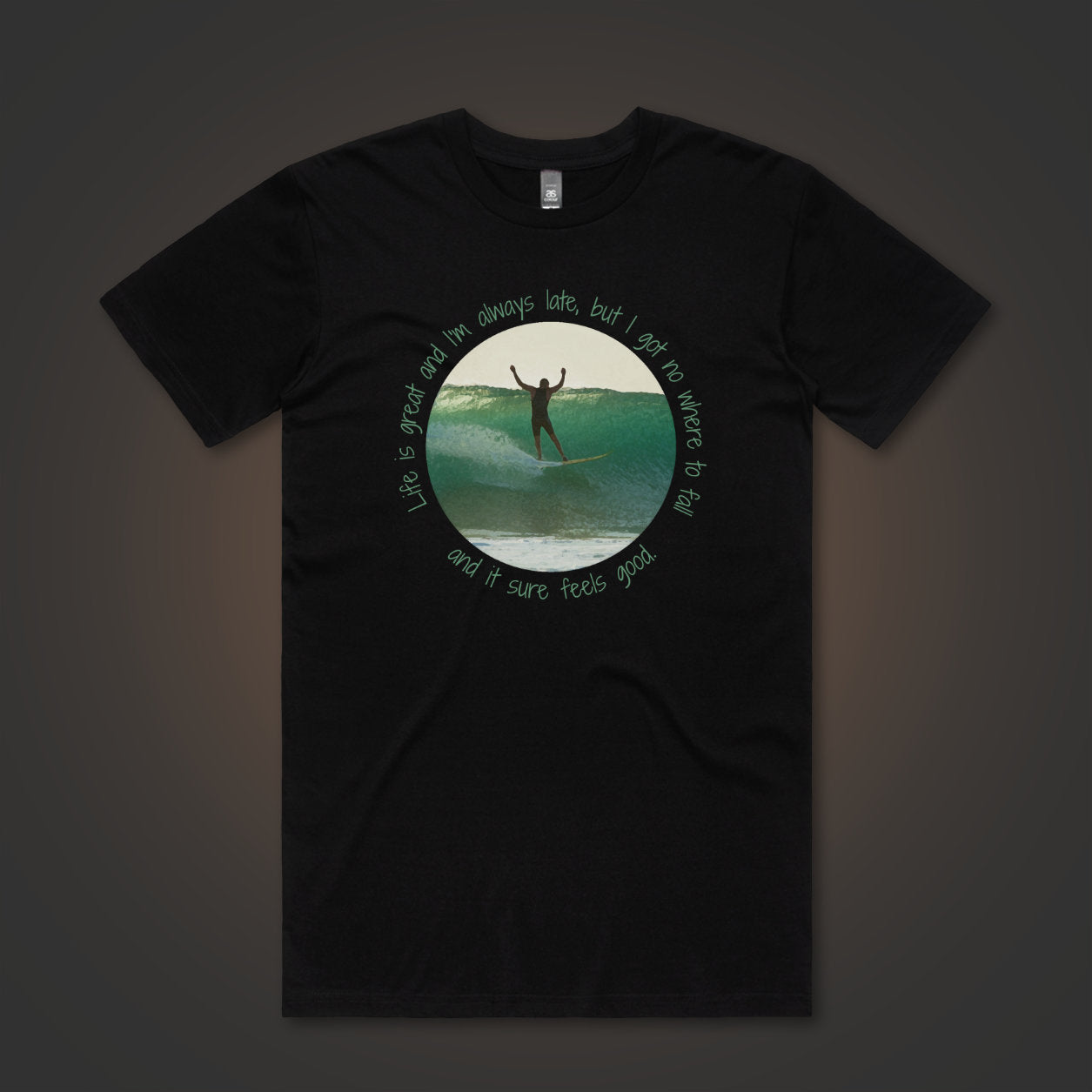 An unnamed surfer holds up his arms in joy on a beautiful late afternoon. We've put it inside a quote from the classic Aussie surf movie Morning of the Earth. The song – ‘Open up your heart’ by G. Wayne Thomas – 1972. Photo by Travis Deane.