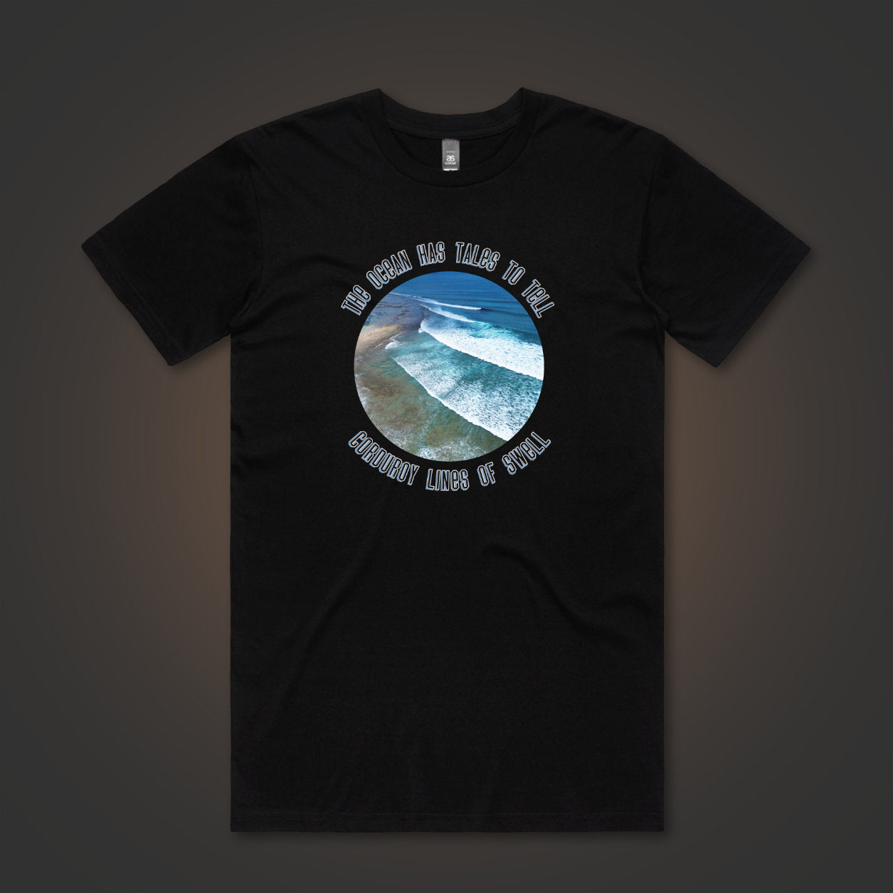 This shirt has a retro inspired vibe, with clean, crisp text surrounding an epic